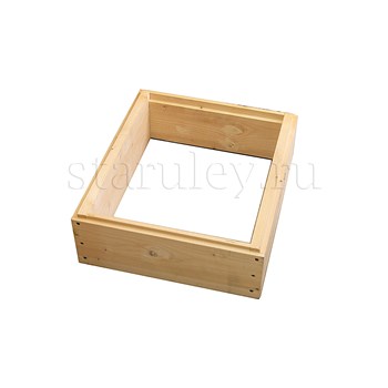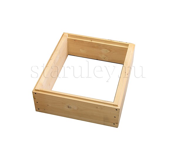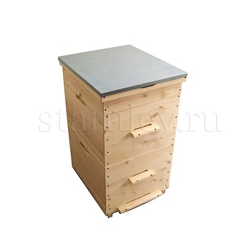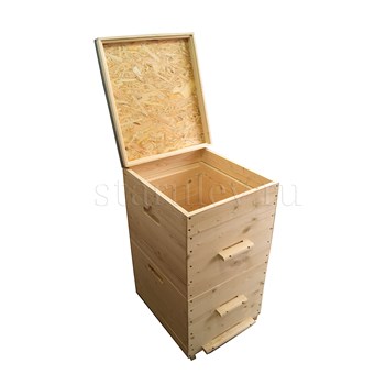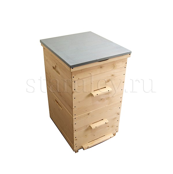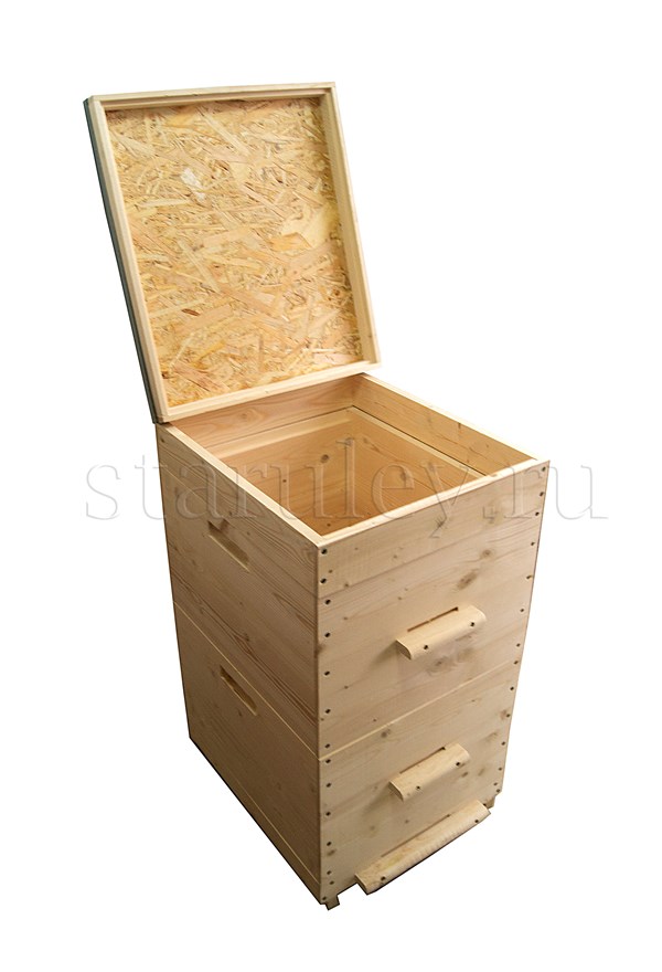 Улей двух-корпусной изготовлен из сосны. Толщина стенок - 35 мм. Высота улья - 82 см, ширина - 52 см.